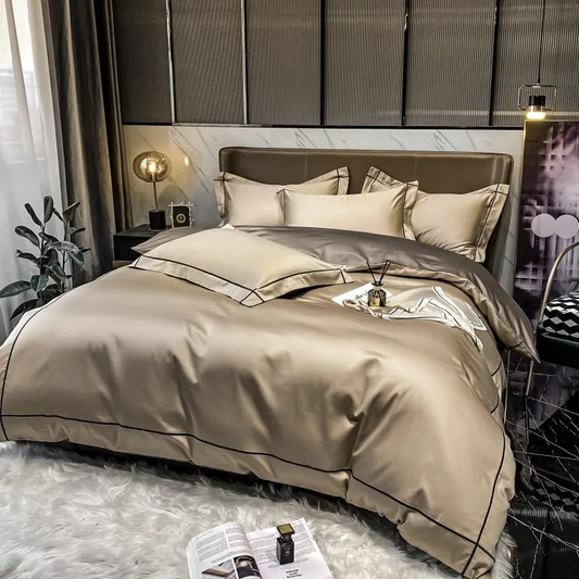 The Glanzreich bedding set embodies subtle, refined comfort. Made from 800-thread-count jacquard cotton, it offers a rich, soft texture that makes every night a sensual experience. The natural sheen of the fabric highlights the elegant gold tone, while the high-quality workmanship ensures durability, breathability, and timeless elegance. A delicate touch of comfort—noticeable at first contact, unforgettable forever.
